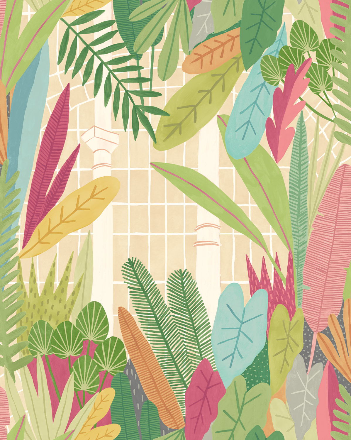 Geïnspireerd door de botanische tuinen van Glasgow komen het binnen- en buitenleven samen in Glasshouse. Lagen van met de hand geschilderde tropische planten overlappen elkaar, met glimpsen van de architectuur van de botanische kassen die door de openingen heen te zien zijn. Het geometrische raster van de glazen huisramen vormt een speelse tegenstelling tot de organische vormen van de tropische bladeren.
