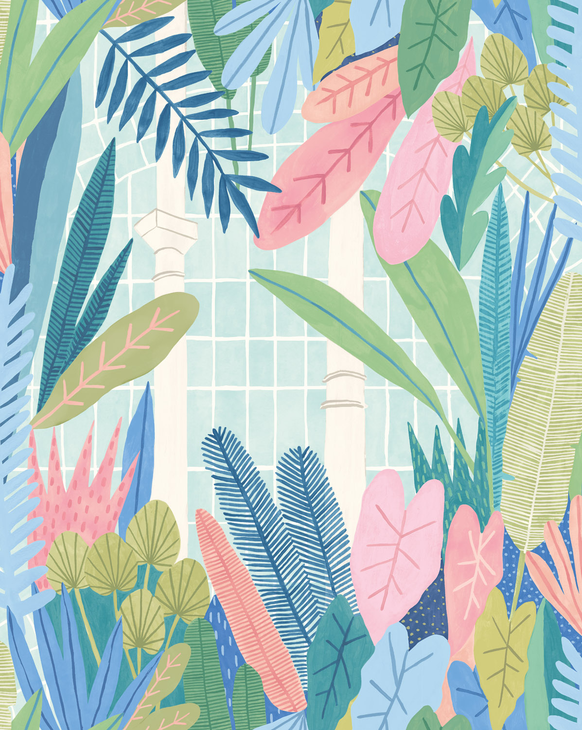 Geïnspireerd door de botanische tuinen van Glasgow, komen het binnen- en buitenleven samen in de Glasshouse. Lagen van handgeschilderde tropische planten overlappen elkaar, met glimpjes van de architectuur van de botanische kas die door de openingen tevoorschijn komen. Het geometrische rooster van de glazen vensters van de kas vormt een speelse tegenstelling tot de organische vormen van de tropische bladeren.