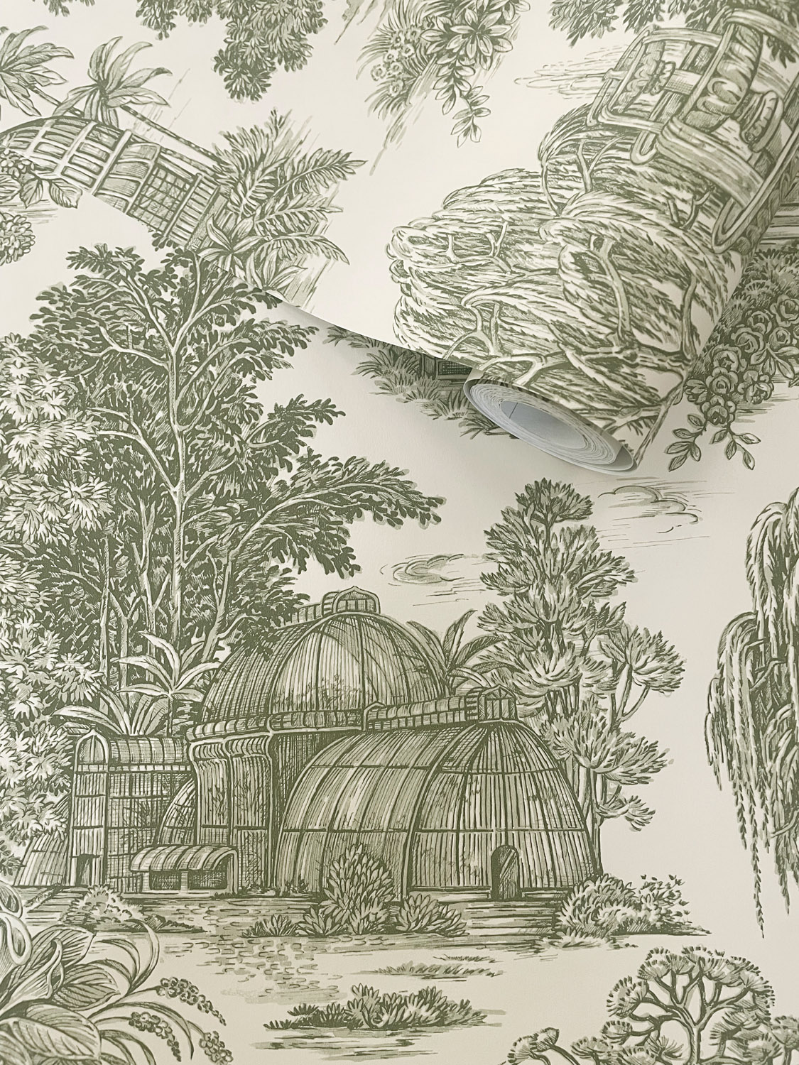 Een ingewikkeld vintage-geïnspireerd toileontwerp waar de tijdloze elegantie van de natuur de architectonische schoonheid ontmoet. De idylle toont weelderige privétuinen met glazen huizen, groen verweven in een serene ruimte, op zoek naar een balans van sereniteit en escapisme die een verhalende charme aan je muren toevoegt.