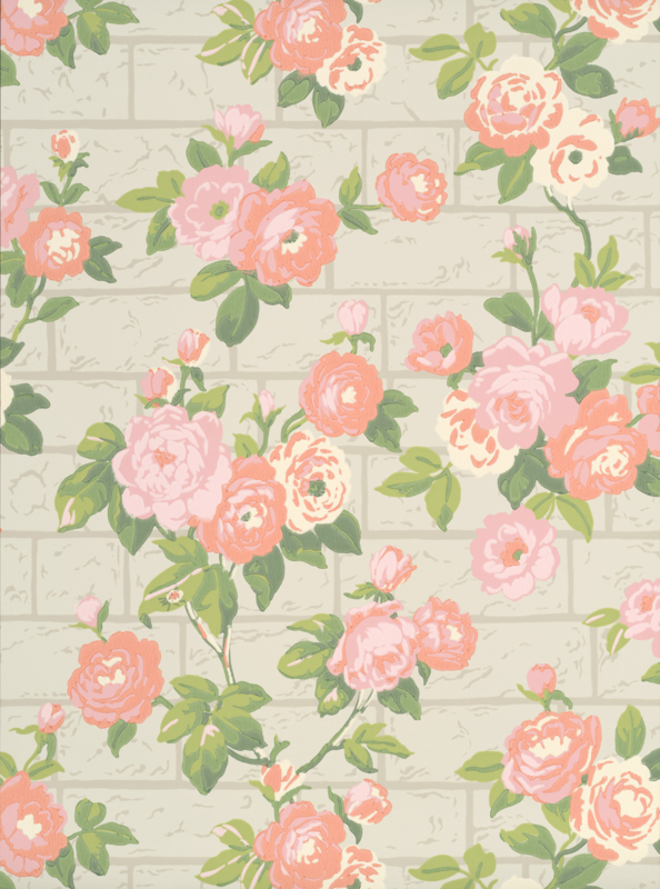Het dessin toont weelderige, klimmende rozen in volle bloei tegen een achtergrond van neutraal natuursteen. Hierdoor voelt het ontwerp zowel eigentijds als nostalgisch aan.