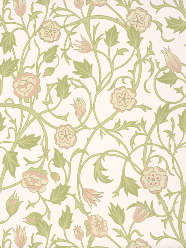 Het sierlijke dessin ‘May’s Tulip’ is geïnspireerd op een prachtig laat-19e-eeuws weefsel met weelderige tulpen, destijds verwerkt in panelen als scheiding tussen ruimten. Dit behang toont een vloeiend netwerk van verstrengelde ranken en sierlijke stelen, doorspekt met gestileerde bloemen en ontluikende knoppen die samen een ritmisch, harmonieus patroon vormen.