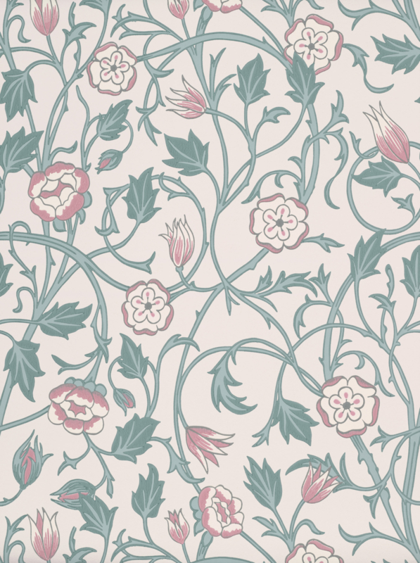 Het sierlijke dessin ‘May’s Tulip’ is geïnspireerd op een prachtig laat-19e-eeuws weefsel met weelderige tulpen, destijds verwerkt in panelen als scheiding tussen ruimten. Dit behang toont een vloeiend netwerk van verstrengelde ranken en sierlijke stelen, doorspekt met gestileerde bloemen en ontluikende knoppen die samen een ritmisch, harmonieus patroon vormen.